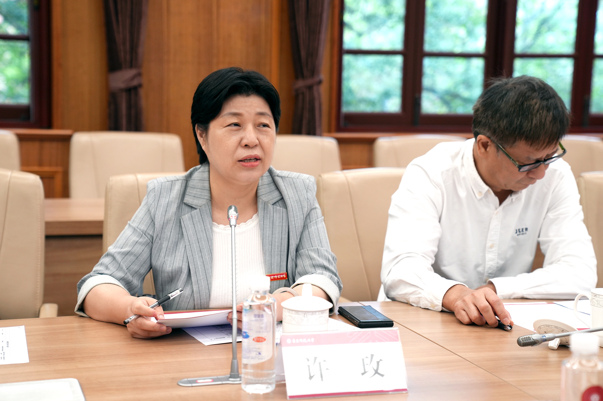 许玫在讲话中对华东师大长期以来的支持和帮助表示感谢。她表示,希望进一步加强两校交流合作,深入落实两校战略合作协议,建立更有效机制,在干部交流、人才引进等方面加强互动,合作开展海南自贸港智库建设,助力海南师大在基础教育、国际教育等领域发展,持续提升学校教学、科研和管理水平。