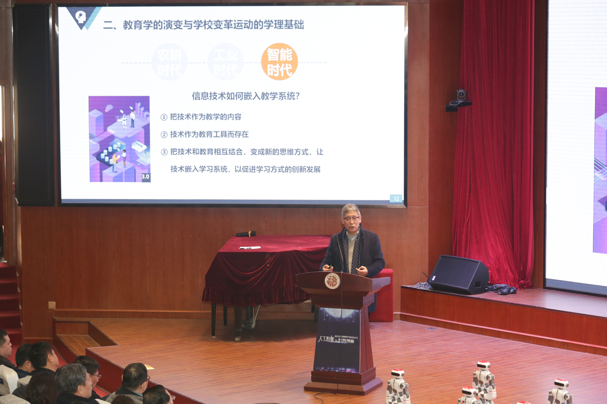 上海市建平中学西校展示了以学生为主体、融合人工智能的课例教学,陈玉琨教授作了精彩点评。