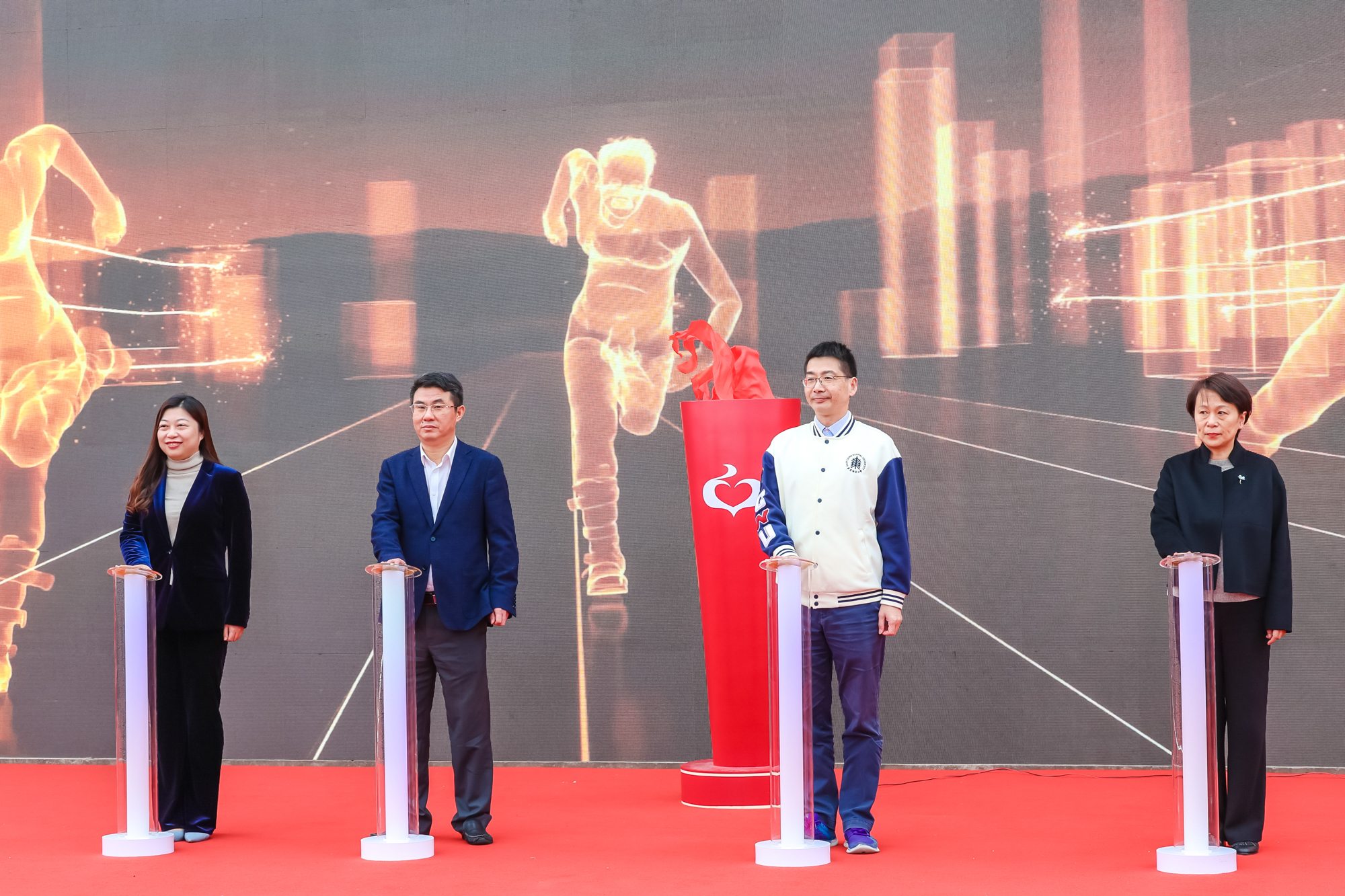 在学校吉祥物“小花狮”的引导下,闵辉、顾红亮、朱敏、王戎四位嘉宾共同点燃主舞台的火炬,宣告2023年上海高校辅导员团队拓展活动正式启动。