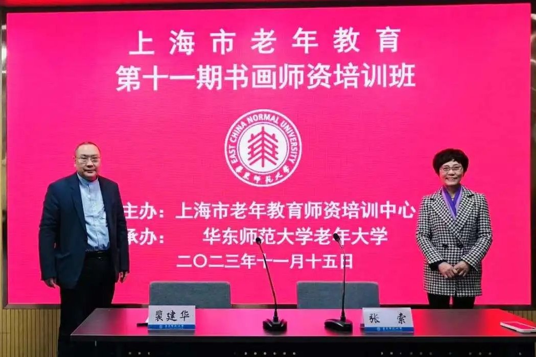 11月15日,由上海市老年教育师资培训中心主办、华东师大老年大学承办的第十一期上海市老年教育书画师资培训班在华东师大图书馆报告厅举行。来自本市、区两级老年大学书画教师、街道老年学校书画教师80余人参加了培训。开班仪式由华东师大老年大学常务副校长裴建华主持。