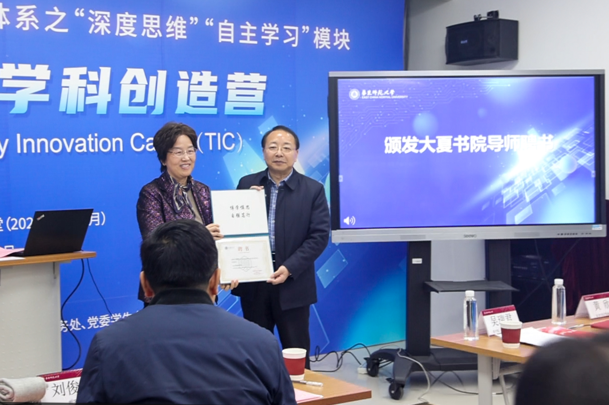 大夏书院院长庞维国为图书馆馆长、未来学习发展中心主任吴瑞君颁发大夏书院导师聘书