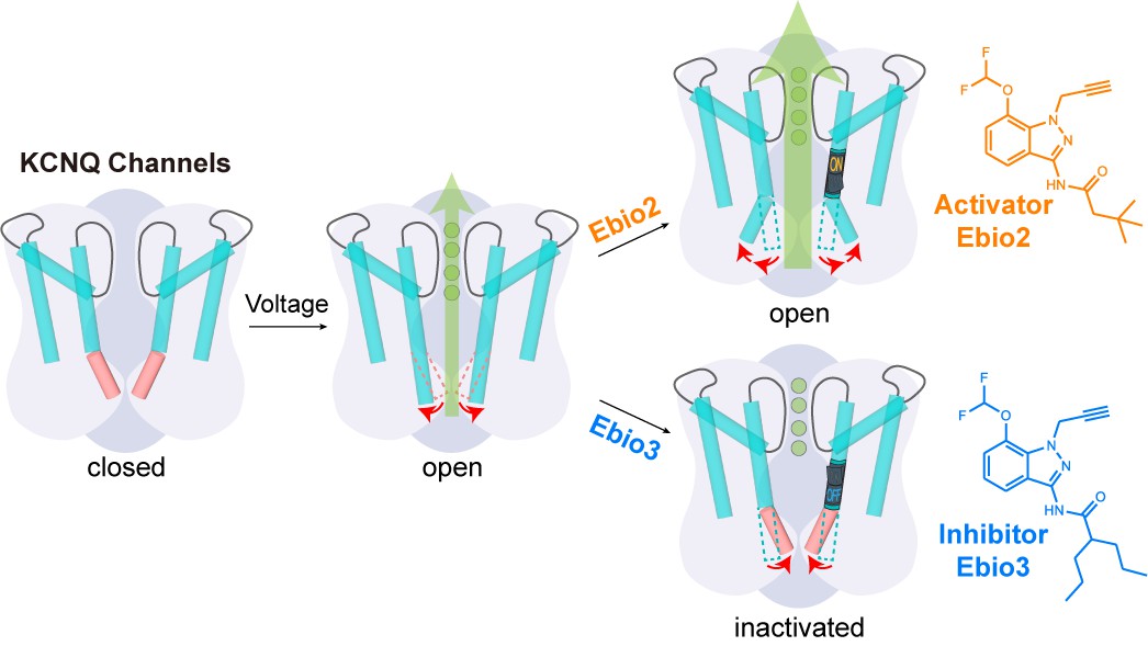 离子通道具有广泛且重要的生理和病理功能,是药物靶标和潜在药物靶标的重要来源。为了解决靶向离子通道药物发现的堵点问题,万象城awcsport官网生命科学学院和药学院阳怀宇课题组持续构建离子通道新调控理论,提出跳出静态结构的局限,从离子通道动态构象中寻找调控机遇。该团队与合作者发现小分子不仅可以靶向离子通道自有动态构象,还可以创造离子通道新构象。近日,阳怀宇教授、张乾森青年研究员与浙江大学基础医学院郭江涛研究员开展深入合作,在利用小分子创造离子通道构象和电生理功能研究中取得新突破,发现可诱导非失活类的电压门控钾通道 KCNQ2 产生失活态的小分子,揭示了小分子诱导激活态产生门控关闭的新型抑制机制,研究成果于2025年1月15日以“Small molecule inhibits KCNQ channels with a non-blocking mechanism”为题在线发表于 Nature Chemical Biology 杂志。