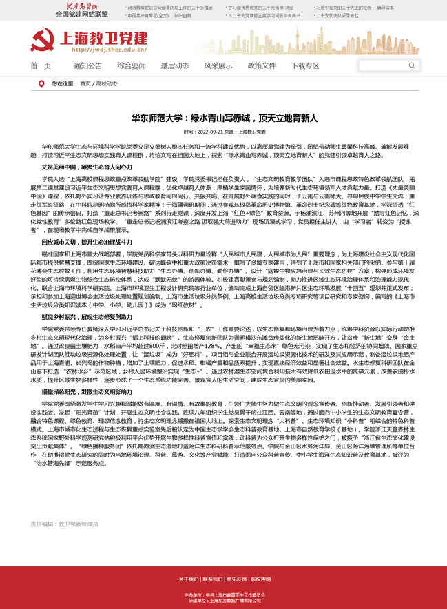 学院入选“上海高校课程思政重点改革领航学院”建设,学院党委书记担任负责人,“生态文明教育教学团队”入选市课程思政特色改革领航团队,拓展第二课堂建设习近平生态文明思想实践育人课程群,优化卓越育人体系,厚植学生家国情怀,为培养新时代生态环境领军人才贡献力量。打造《丈量美丽中国》课程,依托野外实习让专业素养训练与思政教育同向同行、共振共鸣。在开展野外调查实践的同时,于云南与云南师大、寻甸民族中学学生交流,重走红军长征路,在中科院昆明植物所感悟科学家精神;于海疆调研期间,通过参观东极岛革命历史博物馆、革命烈士纪念碑等红色教育基地,学深悟透“红色基因”的传承密码。打造“重走总书记考察路”系列行走党课,深度开发上海“红色+绿色”教育资源。于杨浦滨江、苏州河等地开展“踏寻红色记忆,深化党性教育”多伦路红色现场教学、“重走总书记杨浦滨江考察之路 汲取强大前进动力”现场沉浸式学习,党员担任主讲人,由“学习者”转变为“授课者”,在现场教学中完成自学成果展示。