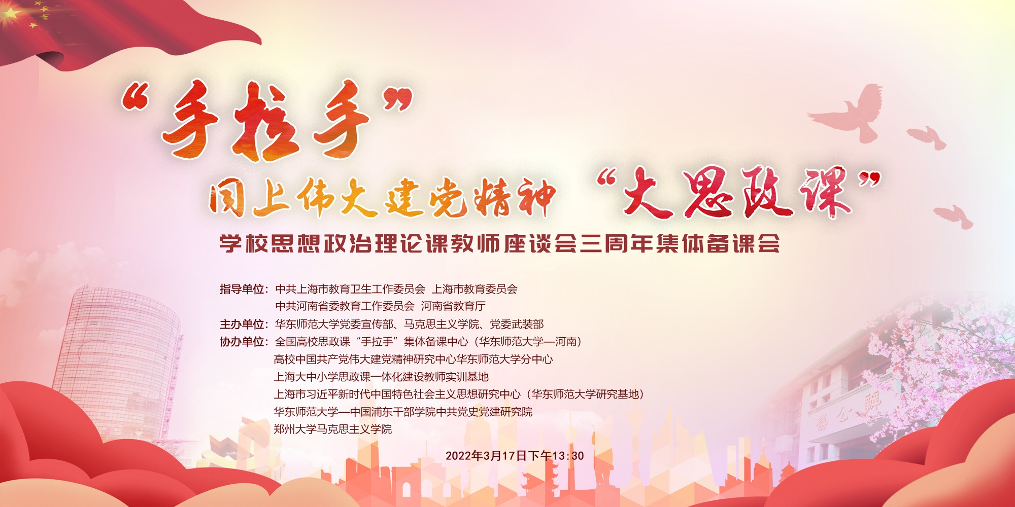 站在党的百年历史新起点,如何将伟大建党精神融入“大思政课”?伟大建党精神进思政课如何取得实效?在习近平总书记主持召开的学校思想政治理论课教师座谈会三周年之际,3月17日下午,华东师大党委宣传部、马克思主义学院和党委武装部联合在线举办“手拉手”同上伟大建党精神“大思政课”集体备课会,沪豫两地专家学者、思政课教师齐聚云端,共研伟大建党精神有机融入思政课教学的方法策略。近5万人在线收看备课会直播。 ...