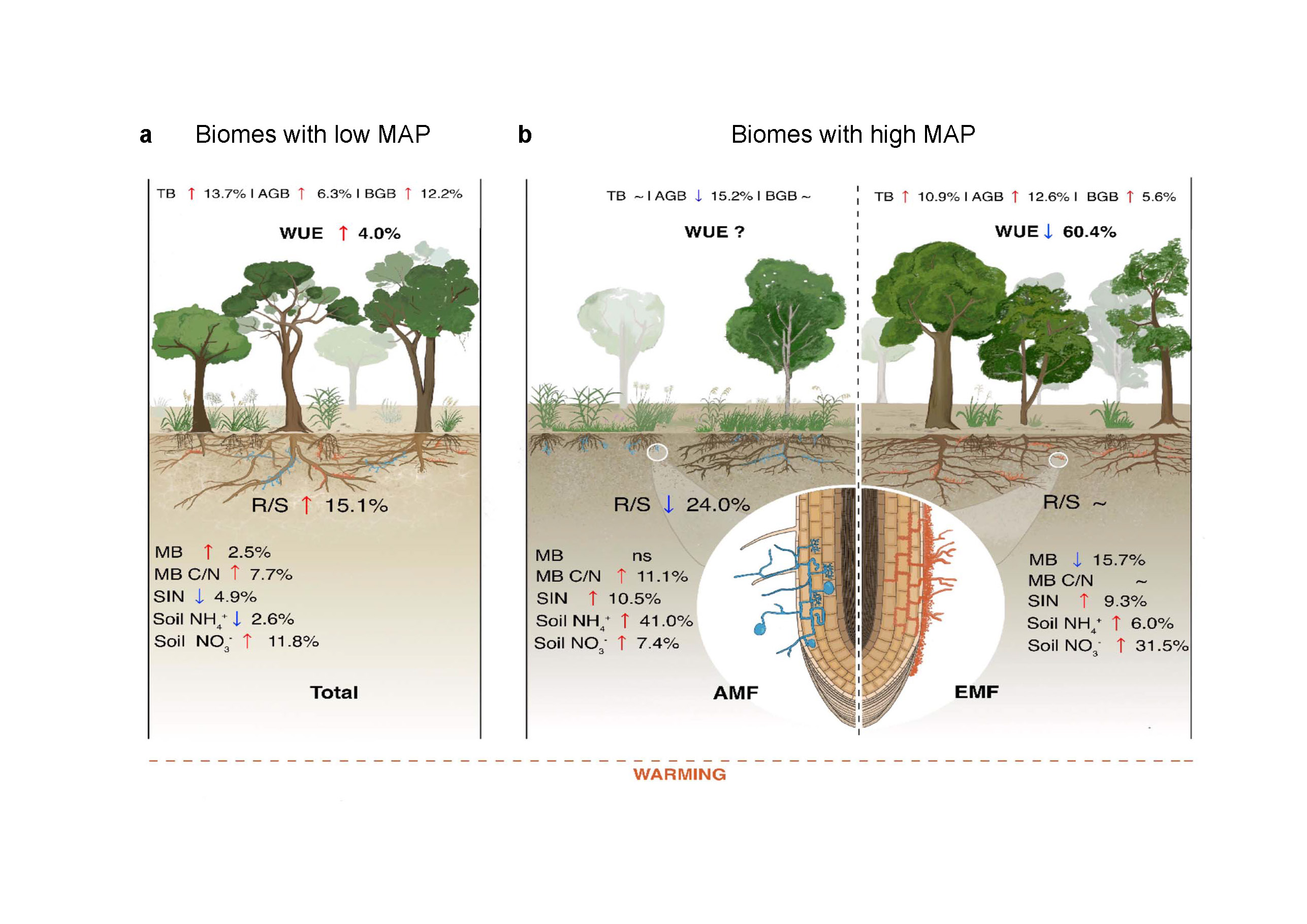 植物地上-地下生物量的分配格局影响陆地生态系统碳循环,是估算生态系统碳存储的关键。在全球变化的背景下,探讨植物生物量分配对气候因子的响应是理解和预测陆地碳存储的基础。然而,在全球增温的背景下植物根冠比(root: shoot ratio, R/S)的响应及其调控因素尚不明晰,基于地上生物量观测数据所进行的生态系统碳存储的估算仍存在极大的不确定性。降雨水平与菌根类型共同调控植物地上-地下生物量对增温的响应 近日,...