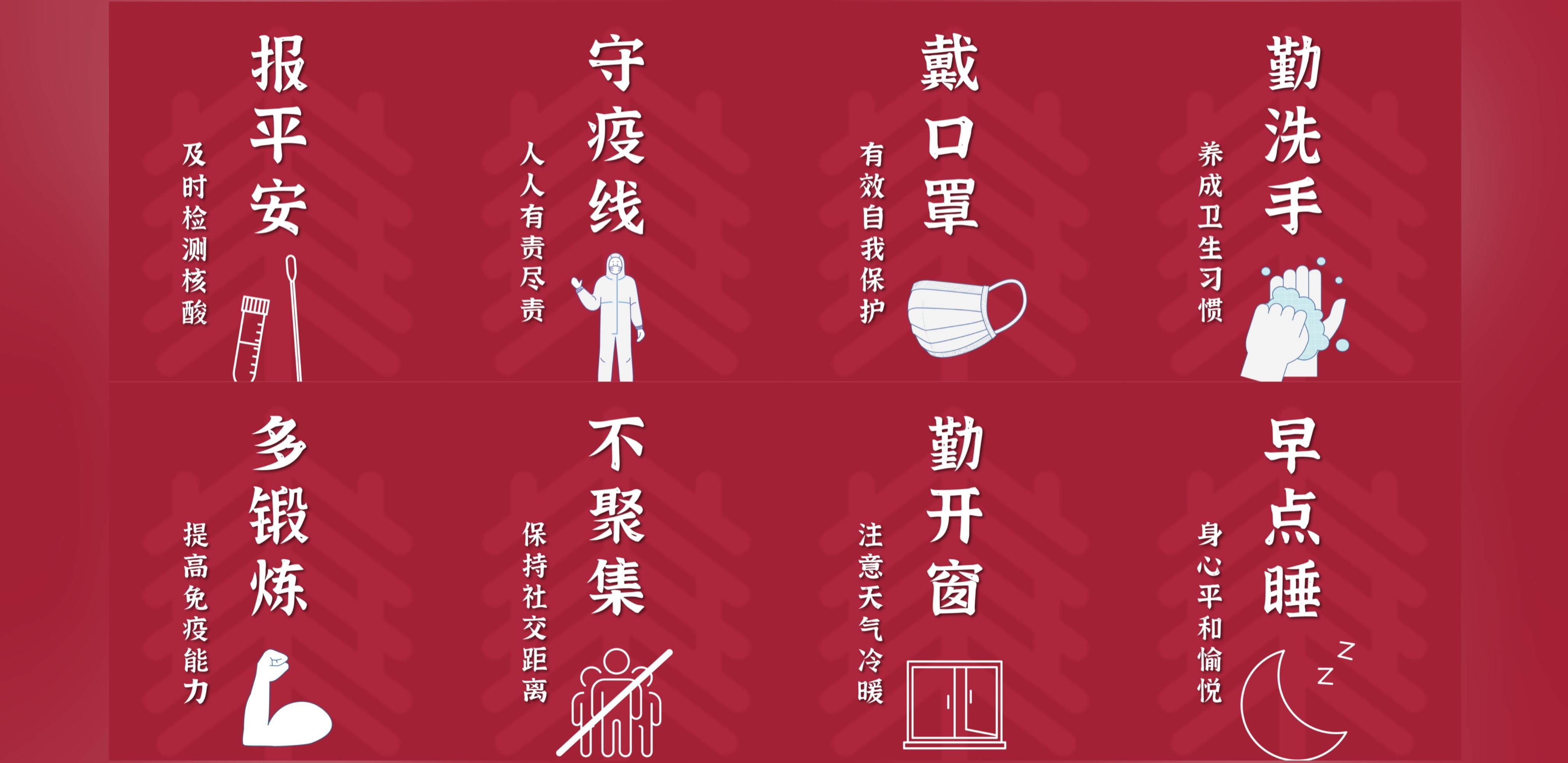 今天你核酸了吗?近期疫情反复,全校师生要保持高度警惕,保护自己,守护校园。请积极主动配合防疫政策,让做核酸、勤扫码成为每个人的自觉行动,全力构筑人人有责、人人尽责的防控共同体。 疫情无小事,防控是关键。请大家坚持“三件套”“五还要”,做到“不扎堆”“不聚集”。外出要佩戴好口罩,并及时更换。秋寒渐起,昼暖夜凉,温差大,要适时增加衣物。海报创意设计|吕安琪 谢心怡 编辑|吴潇岚 于洋 编审|郭文