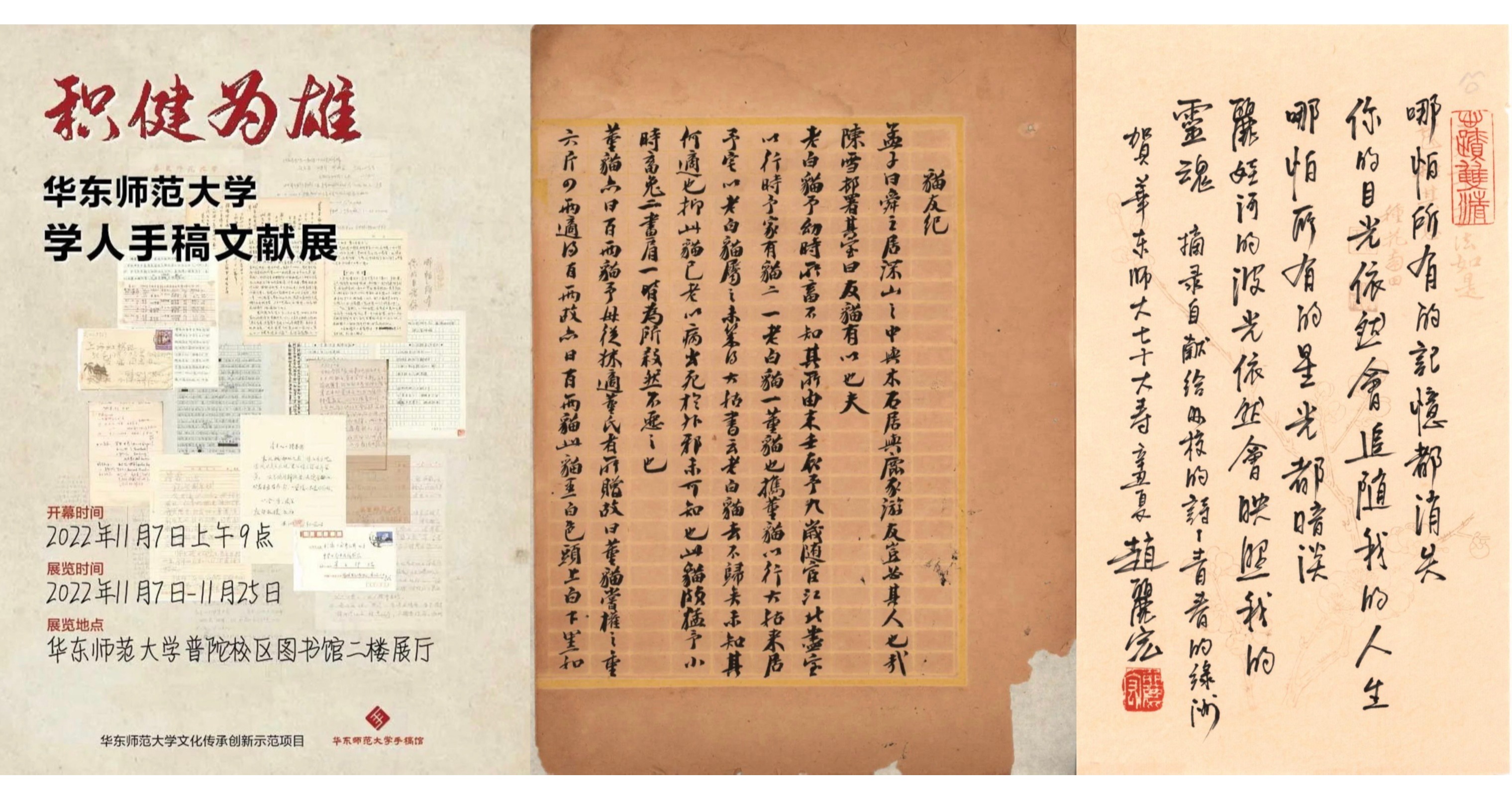 积健为雄,语出唐代司空图《二十四诗品》。雄者,刚也,大也,至大至刚之谓。非一朝可袭取,必积强健之气而可成雄浑之力。 华东师大学人正是在日积月累中成就了雄浑之力,取得辉煌的成就。那么他们是怎样治学、怎样积累的呢,他们有什么不为人知的故事吗?手稿是一个重要媒介,可从中一窥究竟。 本次展览遴选60余位师大学人的手稿,种类齐备,亮点极多,大部分展品首次公开,每一份手稿都配有作者的照片。展厅一瞥-吕...