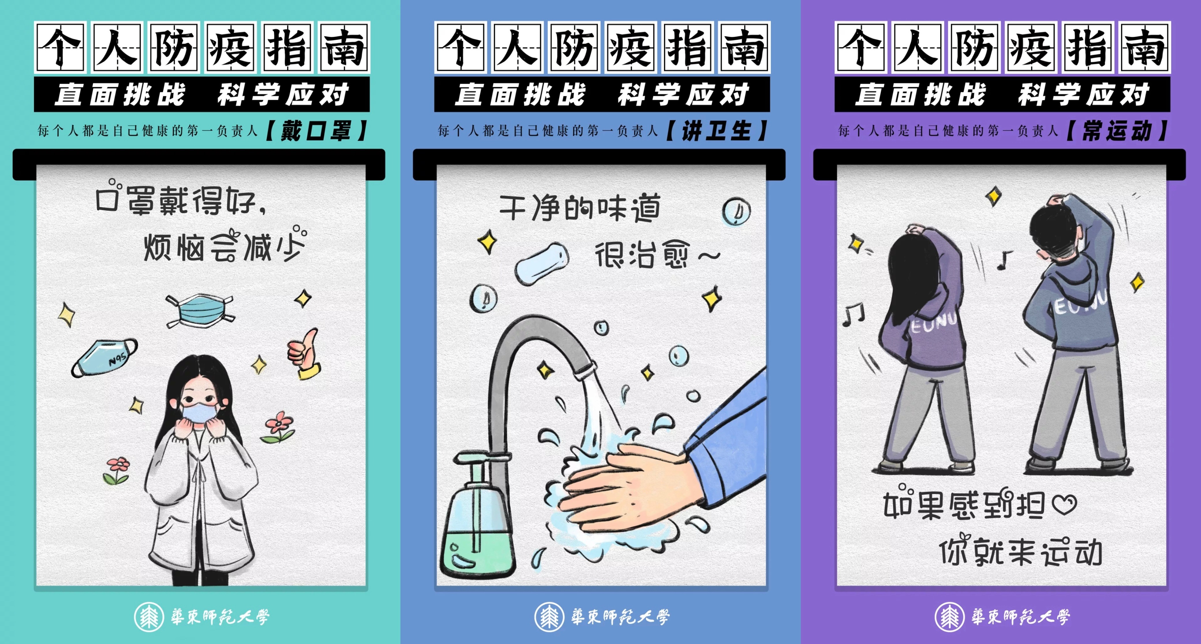 日前,学校进一步优化调整了校园疫情防控措施。全国范围正遭遇第二波奥密克戎疫情,特点是传播性强,又值冬季流感、普通感冒的高发季……现在怎么办? 丽娃、夏雨为大家送上一份个人防疫指南:强调十个“三字诀”,做自己健康的第一责任人!戴口罩 口罩及时换,每个口罩累计佩戴时间不超过8小时;在室内外人员密集场所、乘坐电梯或公共交通工具时,均应规范佩戴口罩;出现发热、干咳、乏力、咽痛等症状时,在医院就医...