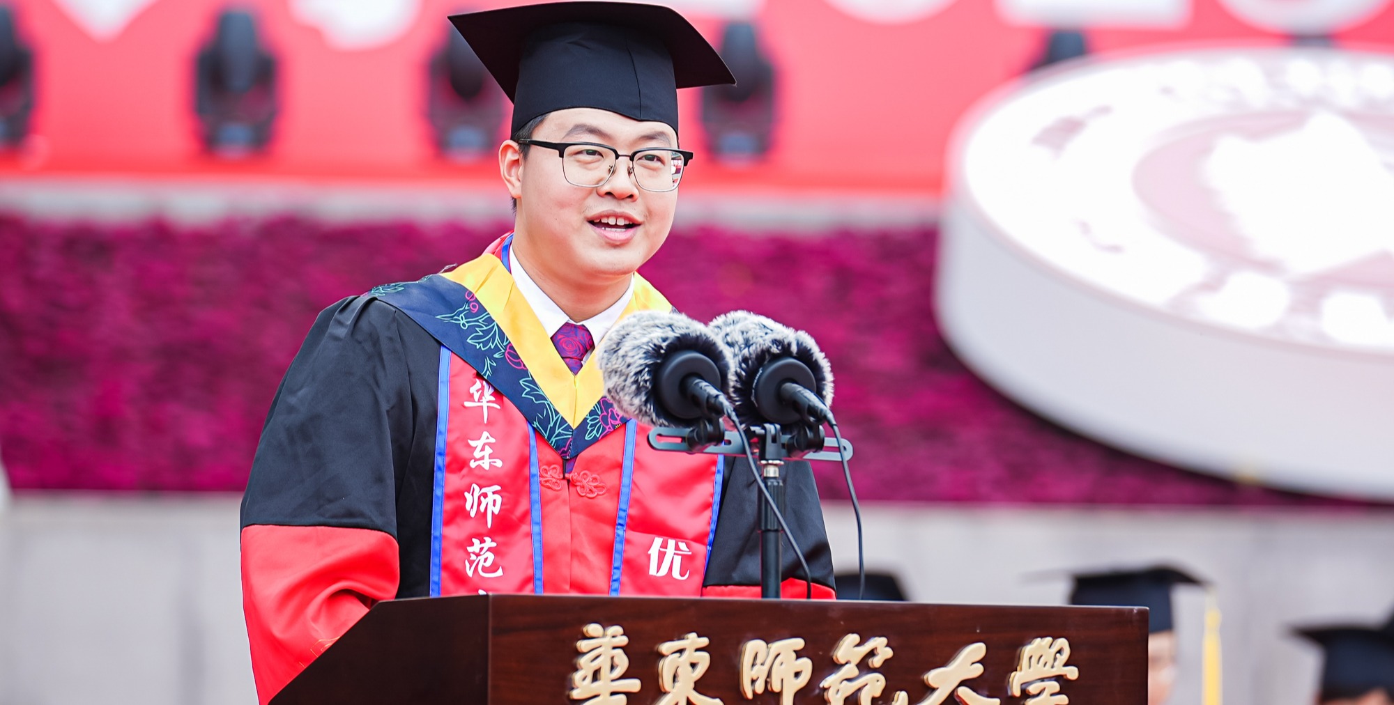 万象城awcsport官网2023届毕业典礼上,晤罕科技公司创始人、来自计算机科学与技术学院的博士毕业生院旺,作为毕业生代表发言。他是国家奖学金、团中央“中国电信奖学金”获得者,荣获“挑战杯”上海市金奖、“互联网+”大赛上海市金奖、研究生人工智能创新大赛全国一等奖、戴森设计奖中国区冠军等。他在华东师大度过了热血励志的研究生时光,从初出茅庐的“科研小白”到创业报国的有为青年,院旺在华东师大收获了“相伴一生的情谊...