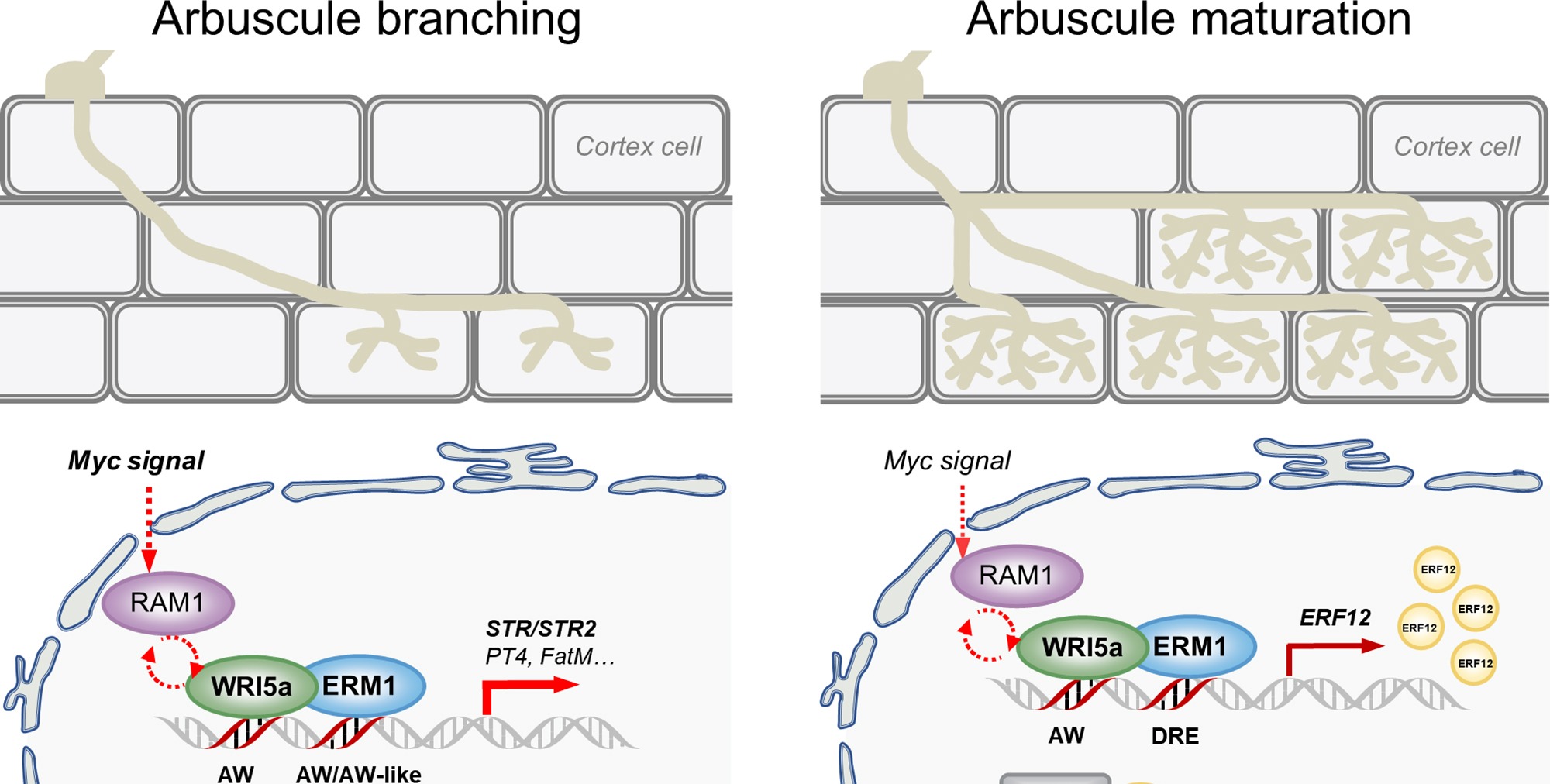 2023年9月16日,万象城awcsport官网生命科学学院姜伊娜研究员课题组和中国科学院分子植物科学卓越创新中心王二涛研究员课题组合作在 Nature Communications 杂志在线发表题为 Control of arbuscule development by a transcriptional negative feedback loop in Medicago 的研究论文。该研究发现,AP2/ERF 蛋白 ERM1/WRI5a-ERF12-TOPLESS 转录复合体形成一个自我调节的正-负反馈环,动态调控营养交换和丛枝发育过程,从而维持互惠...